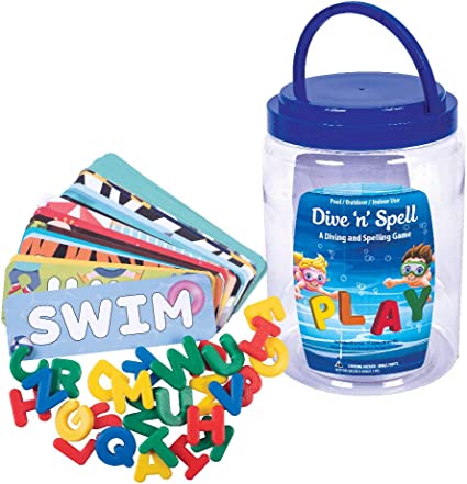 HOW TO PLAY: Throw all of the letters in to the pool, they are weighted and will sink to the bottom. Select a word card and time yourself or race against friends to collect all of the letters needed to spell the word on your card. Create your own game or even try it in the yard for additional ways to play!